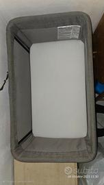 Culla co-sleeping pratica e confortevole, con dolce movimento a dondolo attivabile con una mano e funzione di blocco per la notte. Materasso imbottito incluso, con rivestimento traspirante e lavabile. Dotata di finestrelle in rete per una corretta circolazione dell’aria e struttura morbida e avvolgente per il massimo comfort del bambino. Si aggancia facilmente e in sicurezza al letto grazie a cinghie e clip, con spondina laterale regolabile con una sola mano. Struttura in alluminio leggera e resistente, 11 livelli di altezza regolabili, piedini adattabili e 4 ruote con freno per spostarla comodamente. Compatibile con la maggior parte dei letti.