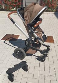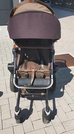 Passeggino in tessuto tecnico impermeabile con vano contenitore sul fondo e sul retro, finiture in pelle, 2 ruote con camera d'aria adatte agli sterrati. Completa di carrozzina bebè praticamente nuova. Completano il tutto una borsa passeggino, una pedana per trasportare il bambino in piedi, una copertura trasparente anti pioggia, un antizanzare e un parasole.