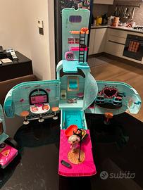 All’interno si trovano anche uno scivolo a due piani, un angolo beauty a specchio, un bar, letto a castello con cuscini ed un barbecue.Adatto per tutte le bambole LoL surpriese.