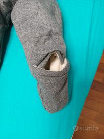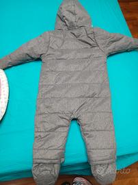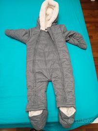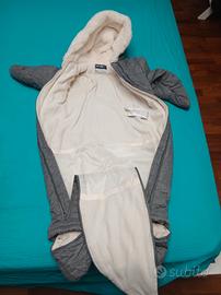 Tutone imbottito colore grigio con cappuccio, copri manine e copri piedini removibili. Dotato di imbottitura calda e morbida. Lavabile in lavatrice.