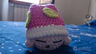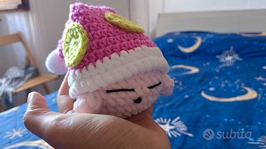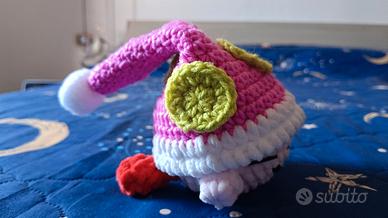 Pupazzo amigurumi all'uncinetto rappresentante Kirby il personaggio Nintendo.