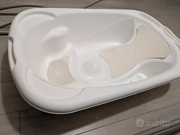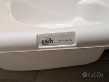 Vendo set completo per il bagnetto del neonato marca CAM, composto da vaschetta ergonomica e supporto in metallo pieghevole. Colore beige/tortora, elegante e neutro. kit è in ottime condizioni, perfettamente pulito e igienizzato. Struttura integra e plastica senza segni di usura. Dimensione: 97L x 52,5P x 23H cm