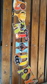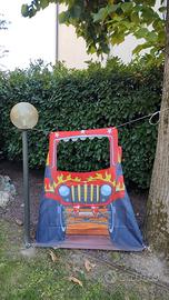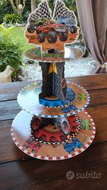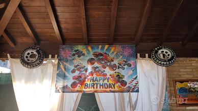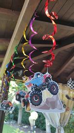 Bellissimo Kit compleanno composto da più di 200 mini adesivi Monster Truck è una quarantina di dimensioni medie, più di 100 tovaglioli, 20 piattini,borsine, tatuaggi, decorazioni (scritta buon compleanno, palloncini, numerosi Monster Truck da appendere con e senza girandole colorate), telo per photobooth (con agganci nella parte superiore), grande telo (178*107) con scritta "Happy Birthday" e vassoio a tre ripiani.