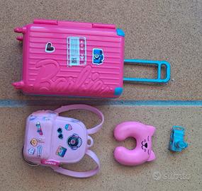 kti viaggio di Barbie con valigia, zainetto, cuscino, macchinetta fotografica e vestito da viaggio.