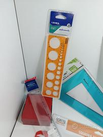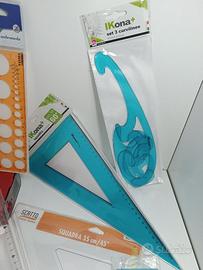 Riga 50cm, squadre 35cm 45 e 60 gradi, Curvilineo, cerchiogravo 1-36mm, ellissografo, righello 20cm