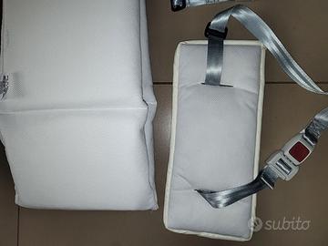 Kit per fissare la culla/navicella all'auto e trasportare il neonato in sicurezza. Comprende: fascia con cintura, agganci per il trasporto in auto, polistirolo di protezione.