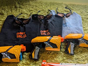Kit NERF 3 Pistole standard, 3 Pettorine, 3 Occhiali protettivi, Fucile a pompa, Pistola con Mirino laser, proiettili vari inclusi.