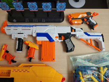 Vendo diverse pistole e fucili Nerf tutti funzionanti e in perfette condizioni, a parte la pistola vicino agli occhiali che è rotta. Inoltre nel kit sono compresi un tiro a bersaglio per Nerf, diversi proiettili e due paia di occhiali protettivi.Per qualsiasi altra info contattatemi pure.
