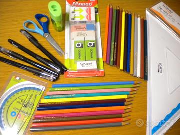 Tutti prodotti NUOVI nuovi, mai utilizzati una sola volta. Ci sono pastelli, gomme, nastri adesivi decorativi, penne, temperino 2 misure con vaschettina, post-it decorati, forbici punte curve, squadra, goniometro, 2 confezioni di Glitter Glue creativity e un astuccio Comix.