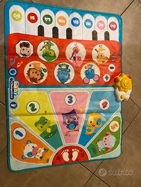 Con 2 modalità di gioco, per apprendere il senso del ritmo, le note musicali, gli strumenti e tanto altro ancora grazie a semplici quiz basati sulle associazioni. Premendo con le mani sui tasti degli strumenti musicali il bambino può ascoltare simpatiche melodie, con il tasto “direttore d’orchestra” si cambia canzone… ed è tutta un’altra musica! E con la modalità di gioco in piedi, premendo i tasti del tappetone con i piedi il bambino impara a riconoscere i versi degli animali e i primi numeri giocando in movimento. Sviluppa la manualità, le capacità motorie e logiche.