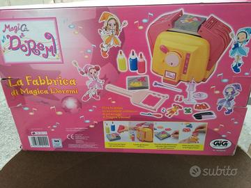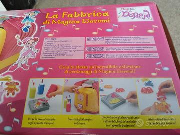 La fabbrica di magica Doremi funzionante con scatola originale, istruzioni, forno, 2 stampini, 3 liquidi grandi e 2 liquidi piccoli, piedistalli, scarpe, 1 bastoncino per estrarre i personaggi dagli stampini, 1 vassoio per il raffreddamento, 1 paletta per inserire gli stampini nel forno, 1 lampadina da 60W / 24V (inclusa), 1 trasformatore.