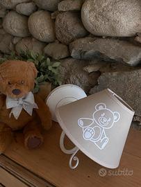 Vendo lampada per cameretta bambini La base è di legno bianca e il paralume è beige decorato con un piccolo orsetto.