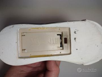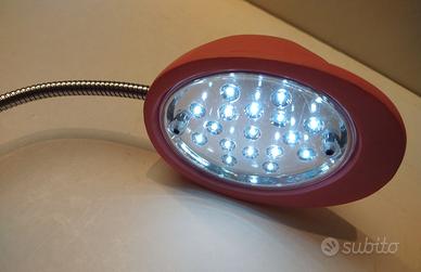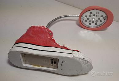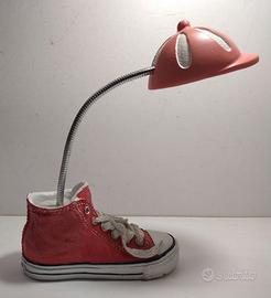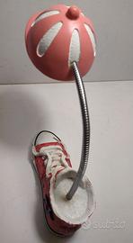 Lampada da tavolo notturna per camera bambini. Tipo sneaker in stile Converse. La luce è a led alimentata con due batterie ministilo da 1,5V. il colore è rosso e bianco. Il braccio flessibile lungo 17 cm. è cromato. Ha l'interruttore a bottone dove c'è la stella blu. Pesa 0,7 kg. Usata, in ottimo stato