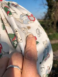 Vendo grazioso lampadario a forma di mongolfiera, rivestito in tessuto, con un orsetto di peluche all'interno del cestino.