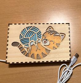 Lanterna con gattino ottima da usare come luce nanna e soggetto per raccontare storie. È fatta in legno artigianalmente, la luce interna è a LED e la luminosità è regolabile da soffusa ad alta. La lanterna puó essere personalizzata per i colori del micio e del gomitolo, e possono essere fatte delle incisioni o dediche sul retro. L'alimentazione è USB, quindi la lanterna è utilizzabile con la presa del carica-telefono (5V) o anche con un powerbank. Per altri soggetti o personalizzazioni contattarmi in privato o visitare la mia pagina IG (lanterne_del_brenta). Posso creare anche lanterne da disegni scelti da voi. A presto!