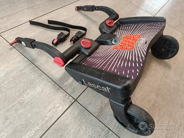 Vendo pedana per passeggino universale Lascal Buggy Board Maxi completa di cordino per sostenerla se non utilizzata e di ganci per fissarlo al passeggino.