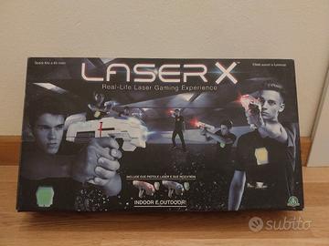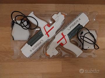 2 pistole laser e due ricevitori perfettamente funzionanti. Colpisce fino a 60m, per interno e esterno. Con effetti sonori e luminosi.