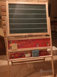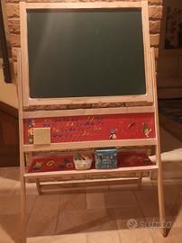 lavagna per bambini a due lati con supporto e gessi bianchi e colorati.