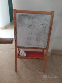 Lavagnetta per gesso e (sul retro) per pennarello. In legno, usata. Il telaio presenta scritte a pennarello.