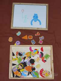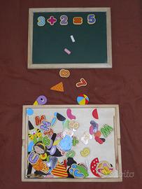 E' incluso un set magnetico di lettere, numeri, simboli matematici ed elementi grafici coloratissimi per scrivere simpatici messaggi, dar sfogo alla creatività del bambino o imparare a leggere.