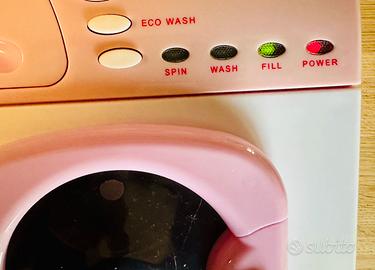 Lavatrice giocattolo a batteria con cestello girevole, luci e suoni realistici. Oblò apribile per caricare la lavatrice e far girare i panni all’interno. Perfettamente funzionante e in ottimo stato. Completa di 3 pile ricaricabili. Misure 22x30x23 cm
