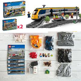 - Lego City 60197: treno passeggeri dotato di un locomotore motorizzato con telecomando Bluetooth a 10 velocità e parte anteriore apribile, cabina di guida con finestrino apribile, 2 carrozze con tetto rimovibile, sedili e tavoli, ferrovia circolare con 16 rotaie curve e 4 binari diritti, oltre a un marciapiede costruibile con 2 posti e mappa dei servizi ferroviari, segnale e 4 minifigures LEGO.