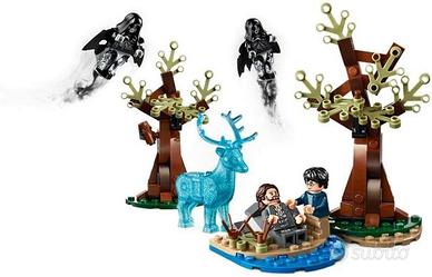 Questo set LEGO® Harry Potter™ contiene una scena nella foresta con una piccola capanna in riva al lago e 2 alberi costruibili con funzione di lancio degli incantesimi, più un cervo brillante e semitrasparente, novità di giugno 2019, con spazio per una minifigure sulla groppa.
