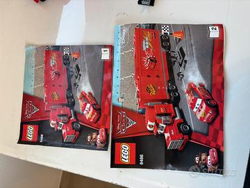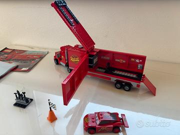 Set LEGO Cars 2, modello 8486, completo ma senza scatola originale. - Include il camion Mack e la macchina di Saetta McQueen. - Presenti anche accessori come la bandiera a scacchi e la cassetta degli attrezzi.