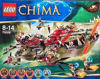 Lego Chima “La nave coccodrillo di Cragger” 70006, anno 2013, fascia di età 8-14, materiale plastica, 609 pezzi, dimensioni cm 48 x 7 x 38, peso gr 1.400, include 6 mini-figure (Cragger, Crominus, Crooler, Rawzom, Leonidas e Lennox), 4 armi, 2 moto d’acqua, adesivi applicati, completo di tutti i pezzi, scatola con alcuni segni di usura