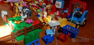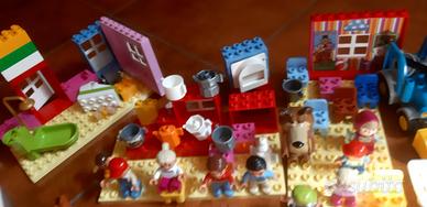 lego duplo ville grandi fattorie compresa di personaggi fra cui masha ed orso. figure animali .arredi della casa e della fattoria con anche trattore e componenti per il lavoro dei campi.