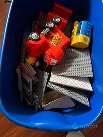 Contiene pezzi di vari set, tra cui: fattoria (con tappeto con campi), trenino che funziona a batterie (con apposite rotaie), cars (con camion e rimorchio) e un set lego per costruire un ring di wrestling (con libretto di istruzioni).