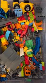 2 contenitori come da foto di Lego Duplo originali. Pezzi vari con treno e binari completi, macchine Cars, fattoria, animali, piattaforma e altri pezzi.