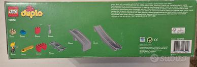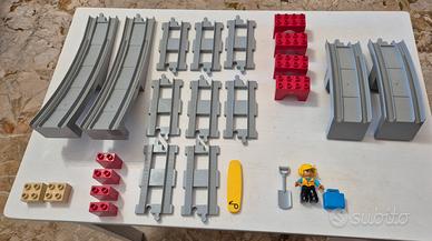 Il playset include 8 binari dritti, 4 pezzi per il ponte, un mattoncino sonoro multifunzione giallo, un personaggio LEGO DUPLO di un operaio, 2 mattoncini, una vanga giocattolo e una valigia.