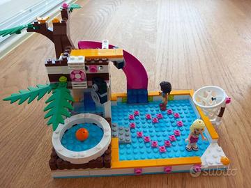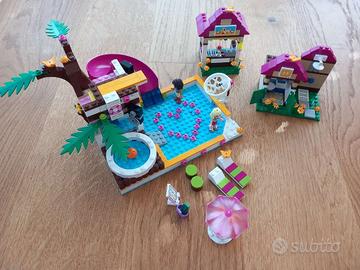 Include le minifigure Andrea e Isabella. Il set comprende piscina, trampolino, idromassaggio caldo, scivolo d’acqua, cascata, spogliatoio e bagno con porte a battente, doccia, 2 lettini, altoparlante, foglie di palma, canestro da basket, pallone, snack bar, tavolo da caffè con ombrellone e sedie, cono gelato, bevande, cassa, soldi, pallone adatto al canestro da basket, fiocco e borsa come accessori.