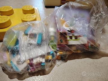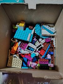 Vari pezzi di lego in una scatola di cartone lego con coperchio di plastica rigida.