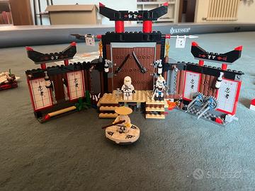 Set originale LEGO Ninjago 2504 – Spinjitzu Dojo, anno 2011. Include il dojo da allenamento, minifigure originali (Zane in bianco, scheletro guerriero, Sensei Wu con cappello e bastone), armi, e base girevole Spinjitzu. Il set è montato e ben conservato, con alcuni piccoli dettagli presenti, ma le istruzioni non sono incluse. Perfetto per collezionisti Ninjago o per ricreare le prime scene della serie.