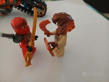 set lego ninjago dotato di 3 personaggi con le rispettive armi e una moto