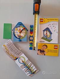 Un orologio giocattolo a forma di casa, assemblabile con mattoncini LEGO, dotato di lancette mobili per ore e minuti che possono essere posizionate manualmente per esercitarsi.