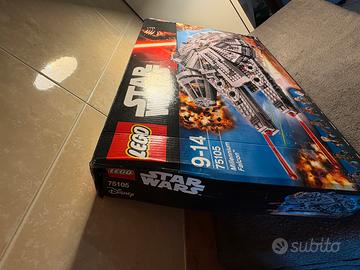 Set LEGO Star Wars Millennium Falcon, numero 75105. - Età consigliata: 9-14 anni. - Personaggi inclusi: Han Solo, Chewbacca, Rey, Finn, Tasu Leech e Kanjiklub Gang Member. - Include anche il droide BB-8. Scatola leggermente rovinata, MAI USATO