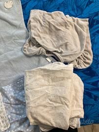 Lenzuola neonato per navicella: 5 lenzuola con angoli, un copri materasso, un lenzuolo, una federa ed un asciugamani. IN REGALO bavaglini Chicco.
