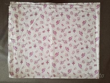 Inoltre, un lenzuolo sopra con fantasie viola, rosa e lilla come visibile in foto, ed una federa piccola per cuscino bianca con cuoricini rosa.