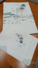 lenzuolino lettino in puro lino con tutta la balza ricamata a mano soggetti colorati: fattoria e mongolfiera