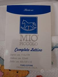 Lenzuolino per lettino con le sbarre, ricamato a mano a punto croce composto da lenzuolo sopra 115cm×170cm, sotto con angoli e federa, volendo si può inserire il nome della bambina, nuovo mai utilizzato nella sua scatola originale
