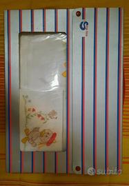 Set lenzuolino in flanella per culla. Nuovo. Mai utilizzato. Il lenzuolino di sopra misura cm 122×170. La federa cm 64×40. Il lenzuolo di sotto ha gli elastici agli angoli e misura cm 93×167.