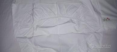 Lenzuolo per culla ricamato a mano ,3 pezzi copri materassino, lenzuolo e federa per cuscino. Usato poco vendo per inutilizzo. Non esitate a contattarmi per ulteriori informazioni.