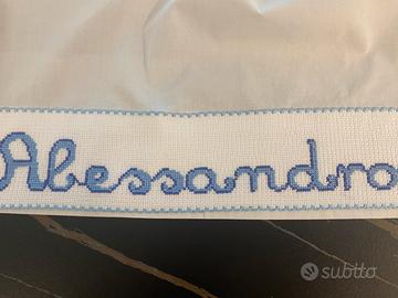 Lenzuolo per culla o lettino con nome Alessandro ricamato a mano.