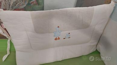 I paracolpi sono morbidi e alti e ricamati. Si legano al lettino tramite i lacci che ci sono ad ogni estremità. Il lenzuolo è ricamato e nella sacca ci si infila il piumino. E' marcato Mary baby