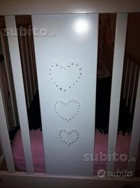 Vendo lettino Fantasy Azur serie "Cuori e Stelle" decorato con preziosi strass in ottimo stato euro 180 (valore nuovo superiore a 430?)in legno di faggio massiccio, con ruote piroettanti, rivestite in gomma antigraffio e dotato di freno di bloccaggio, rete ortopedica realizzata a doghe di legno, pratico cassetto sottostante. Volendo vendo anche a parte accessori Lampadario, mensola e abatjour. Con materasso anallergico, antiacaro e antibatterico completamente sfoderabile e lavabile euro 230.