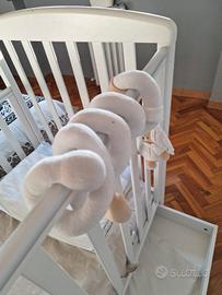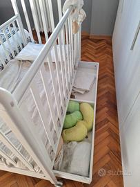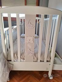 Lettino a cancelli marca Italbaby del 2020, in legno bianco 130x70 cm, con ruote per spostamenti pratici, e contenitore. compreso materasso in memory spesso 10cm circa, 2 set di lenzuoli, trapunta e copritrapunta, 2 cuscini, zanzariera. Tutto in ottime condizioni. il letto presenta sulla struttura una piccola sbucciatura, come da foto, facilmente recuperabile con un po di vernice/smalto.