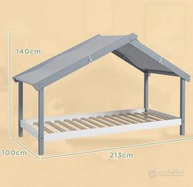Vendo letto singolo con capanna in legno , misure : lunghezza 213 cm , altezza 140 cm , profondità 100 cm , nuovo ancora nella scatola , struttura solida rete a 15 doghe , peso massimo 120 kg , materasso compatibile (non compreso) 90x190 cm , colore bianco e grigio